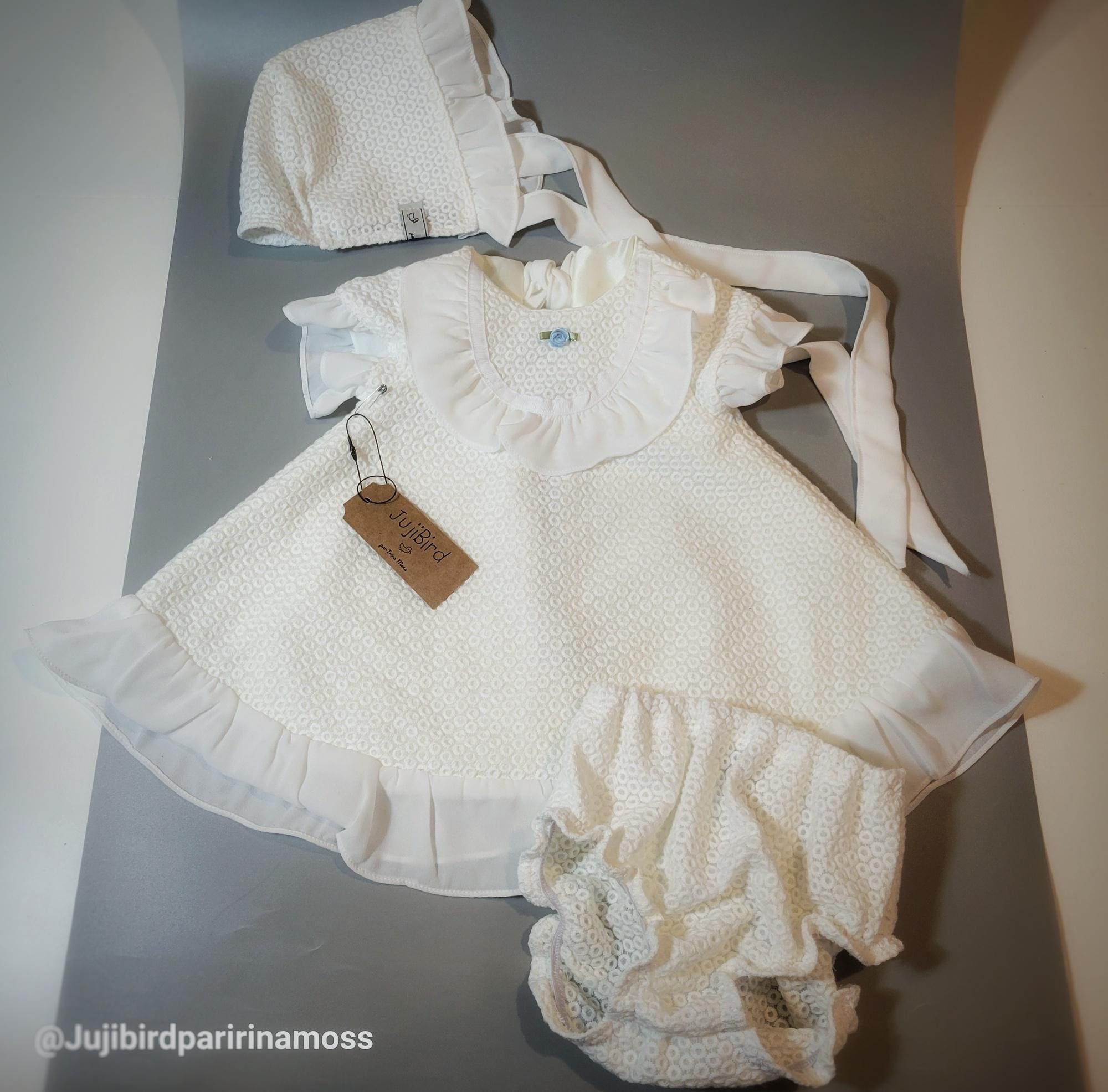 MADE to ORDER fancy vintage-inspired set: A-line dress embellished with ruffles, bloomers, bonnet - perfect for a newborn gift, baptism, christening , baby naming, photoshoot etc.